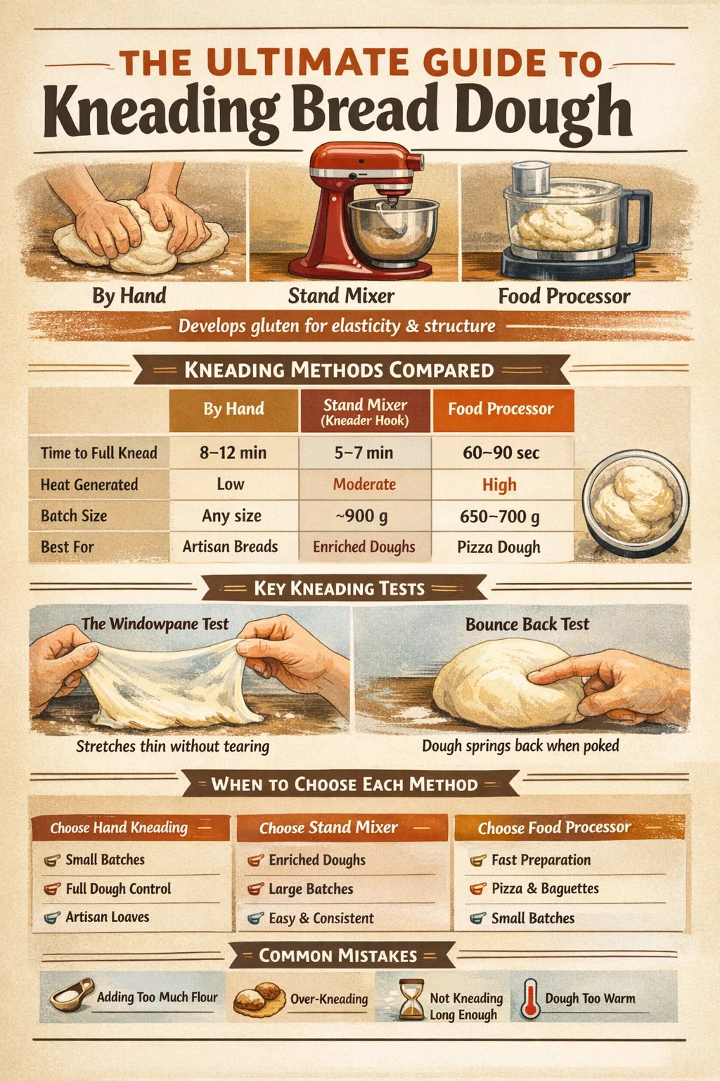 Či už pripravujete sendvičový chlieb, cesto na pizzu alebo mäkké rožky, miesenie je krok, ktorý určuje všetko. Cesto vymiesite efektívne ručne za 8–10 minút, so stojanovým mixérom za 5–7 minút alebo s kuchynským robotom len za 60–90 sekúnd. Každá metóda aktivuje lepok odlišne a vyhovuje rôznym pekárom v závislosti od ich nástrojov, veľkosti šarže a od toho, koľko fyzického zapojenia do procesu chcú. Táto príručka podrobne pokrýva všetky tri metódy – vrátane techniky, načasovania, bežných chýb a presného času použitia a hnetač príloha verzus robiť to ručne.