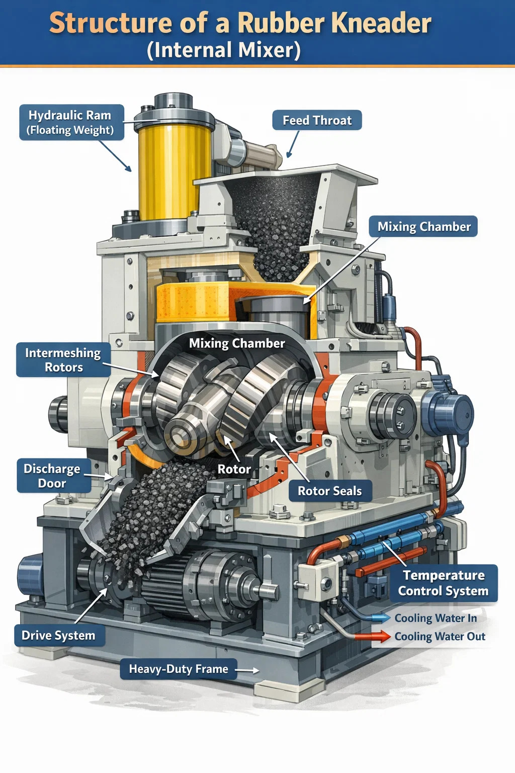 Štruktúra jadra gumového miesiča pozostáva zo šiestich primárnych systémov: miešacej komory, rotorov, hydraulického piesta (plávajúca hmotnosť), mechanizmu vypúšťacích dvierok, systému regulácie teploty a systému pohonu. Každý z nich hrá odlišnú mechanickú úlohu a pochopenie ich vzájomného pôsobenia odhalí, prečo sa vnútorné miesiče stali priemyselným štandardom pre výrobu gumy pri výrobe pneumatík, tesnení, hadíc a výrobkov z technickej gumy.