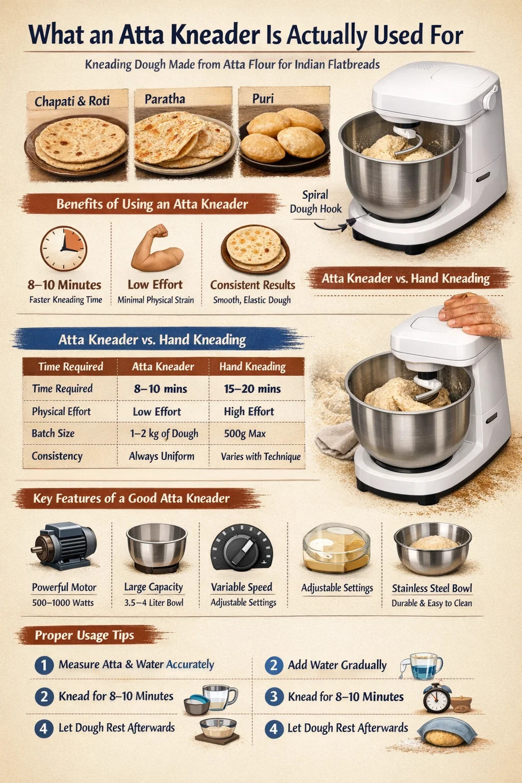 Kritickým bodom je, že atta – celozrnná múka s vyšším obsahom vlákniny ako rafinovaná múka – je hustejšia a odolnejšia voči hydratácii. Hnetač postavený pre atta je kalibrovaný tak, aby zvládol túto hustotu bez prehriatia motora alebo namáhania mechanizmu.